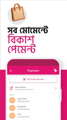 bKash App এর হোম স্ক্রিনে থাকা 'স্ক্যান কিউআর' বাটন ব্যবহার করে দোকানপাটে দ্রুত ও নির্ভুল পেমেন্ট করুন, এজেন্ট পয়েন্ট থেকে ক্যাশ আউট করুন অথবা অন্য bKash ব্যবহারকারীদের সাথে সেন্ড মানি করুন। এছাড়াও, Robi, Airtel, Banglalink, Grameenphone এবং Teletalk সহ সকল প্রধান মোবাইল অপারেটরের জন্য দ্রুত মোবাইল রিচার্জ করুন বা পোস্টপেইড বিল পরিশোধ করুন। আপনার মোবাইল অপারেটরের সেরা অফার এবং ইন্টারনেট, ভয়েস ও বান্ডেল প্যাকগুলো অ্যাপের মাধ্যমেই দেখুন ও কিনুন। ঘরে বসেই বিদ্যুৎ, গ্যাস, ইন্টারনেট এবং অন্যান্য মাসিক ইউটিলিটি বিল পরিশোধ করে জীবনকে আরও সহজ করুন। ঘন ঘন ব্যবহৃত লেনদেনগুলির জন্য 'আমার bKash' বিভাগে শর্টকাট তৈরি করে সময় বাঁচান।