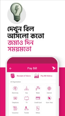 bKash App শুধু লেনদেনের জন্যই নয়, এটি আপনার জীবনযাত্রার সঙ্গী। ফুড ডেলিভারি, অনলাইন শপিং, বাস, ট্রেন, লঞ্চ, বিমান ও সিনেমার টিকিট এবং হোটেল বুকিং সহ আরও অনেক জীবনমুখী সেবা এখন আপনার হাতের মুঠোয়। আপনার কাছাকাছি সেরা bKash অফারগুলো এক নজরে দেখতে পারবেন 'অফার' সেকশনে। আপনার জন্য নতুন সেবা, মার্চেন্ট, বিলার বা অংশীদারদের সম্পর্কে bKash থেকে পরামর্শ পেতে পারেন। আপনার সর্বশেষ bKash লেনদেন এবং প্রচারমূলক অফারগুলির বিজ্ঞপ্তি 'ইনবক্স' বাটনে পাবেন।