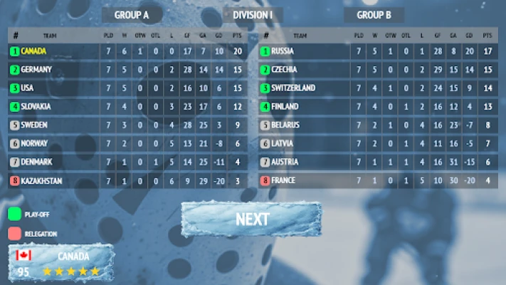 বিভিন্ন বিভাগে বিভক্ত জাতীয় দলগুলোর মধ্যে রোমাঞ্চকর প্রতিযোগিতা অপেক্ষা করছে। প্রতিটি গ্রুপে আটটি দল নিয়ে গঠিত টুর্নামেন্টের গ্রুপ পর্বে আপনাকে সাতটি ম্যাচ খেলতে হবে। বাস্তব হকি ম্যাচের মতোই পয়েন্ট সিস্টেমের মাধ্যমে বিজয়ী নির্ধারিত হবে: নির্ধারিত সময়ে জয়ের জন্য ৩ পয়েন্ট, অতিরিক্ত সময় বা পেনাল্টি শুটআউটে জয়ের জন্য ২ পয়েন্ট, এবং পরাজয়ের জন্য ১ পয়েন্ট। প্রতিটি গ্রুপের শীর্ষ চারটি দল প্লেঅফে প্রবেশ করে, যেখানে সবচেয়ে দুর্বল দল নিচের বিভাগে নেমে যায় এবং দুটি সেরা দল উন্নীত হয়। ঐতিহাসিক হকি প্রতিদ্বন্দ্বিতা যেমন রাশিয়া-কানাডা সুপার সিরিজ অথবা সুইডেন-ফিনল্যান্ড স্ক্যান্ডিনেভিয়ান ডার্বির মতো ম্যাচগুলো এখানে নতুন করে জীবন্ত হয়ে ওঠে। আপনি নিজের পছন্দমতো একটি হকি লিগ তৈরি করতে পারবেন, দলগুলোর নাম ও শক্তি নির্ধারণ করে নিজস্ব চ্যাম্পিয়নশিপের আয়োজন করতে পারবেন এবং এমনকি প্রতিটি দলের খেলোয়াড়দের নামও পরিবর্তন করতে পারবেন।